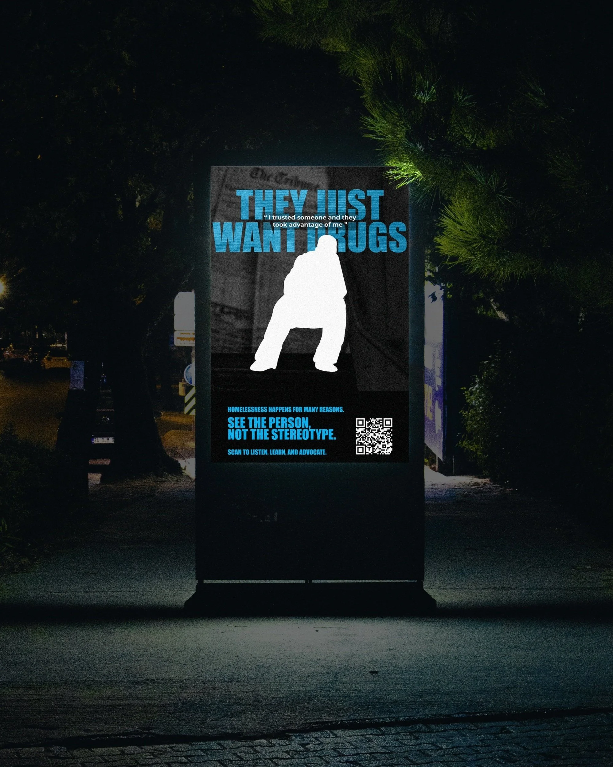 This poster series intends to foster awareness and build empathy toward the unhoused community. Each piece strategically features a commonly spoken microaggression in bold, dominant text, capturing the viewer’s attention. This confronts the viewer with their own possible harsh judgments. Then, within this text, a smaller, intimate, personal story of someone experiencing homelessness is shared. This reveals the deeper reality of their situation. By first confronting the viewer with a harsh judgment and then guiding them to a more humanizing perspective, the execution challenges privileged assumptions and encourages a shift toward understanding and compassion.